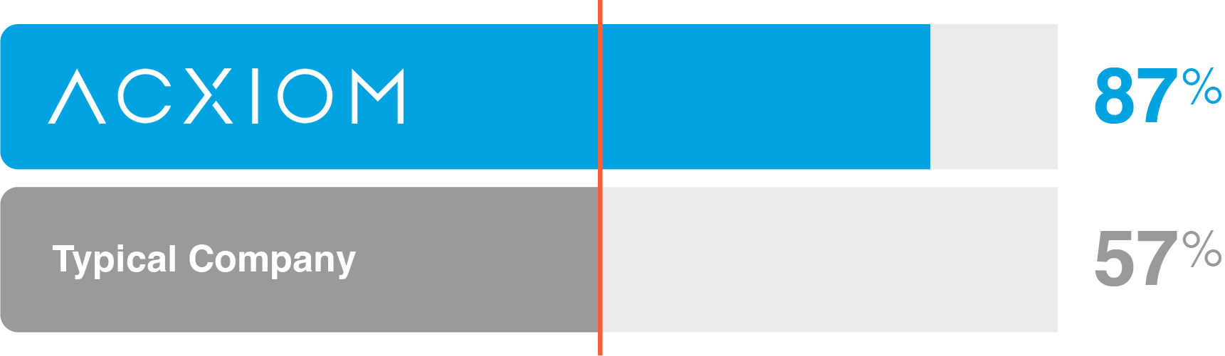 87% of employees at Acxiom LLC say it is a great place to work compared to 57% of employees at a typical U.S.-based company.