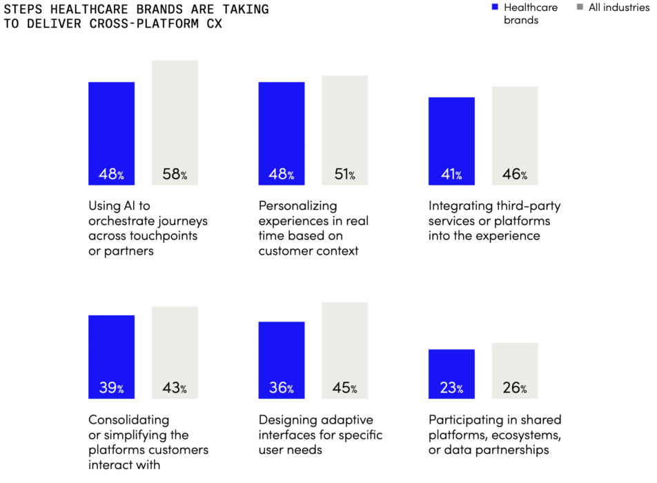 Many healthcare leaders are now looking to AI to help bridge the gaps by orchestrating journeys across touchpoints and partners. They’re taking a host of other steps, too – even if they’re being a little more cautious in their efforts than brands in other industries.