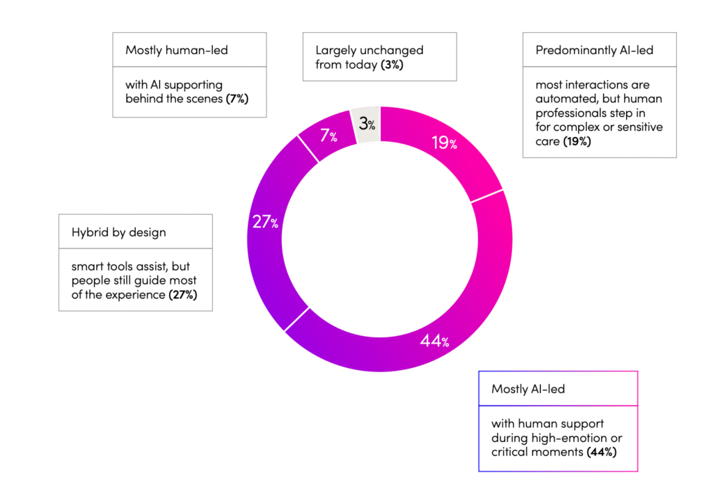 In the next 10 years, the customer experience healthcare organizations provide will either be mostly AI-led or hybrid by design. That’s according to 73% of healthcare leaders.