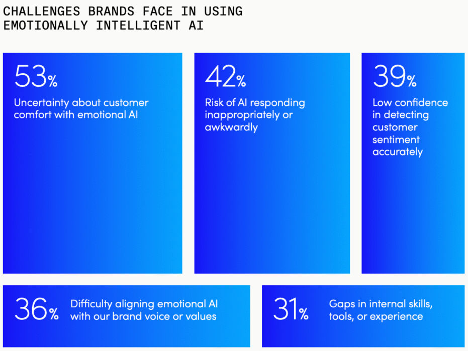 But the road to empathic AI isn’t straightforward. Almost all healthcare leaders (94%) say building emotionally intelligent AI into customer interactions presents a challenge for their organization. Customer acceptance is the most commonly cited obstacle, followed by the risk of the technology providing problematic responses or simply failing to perform.