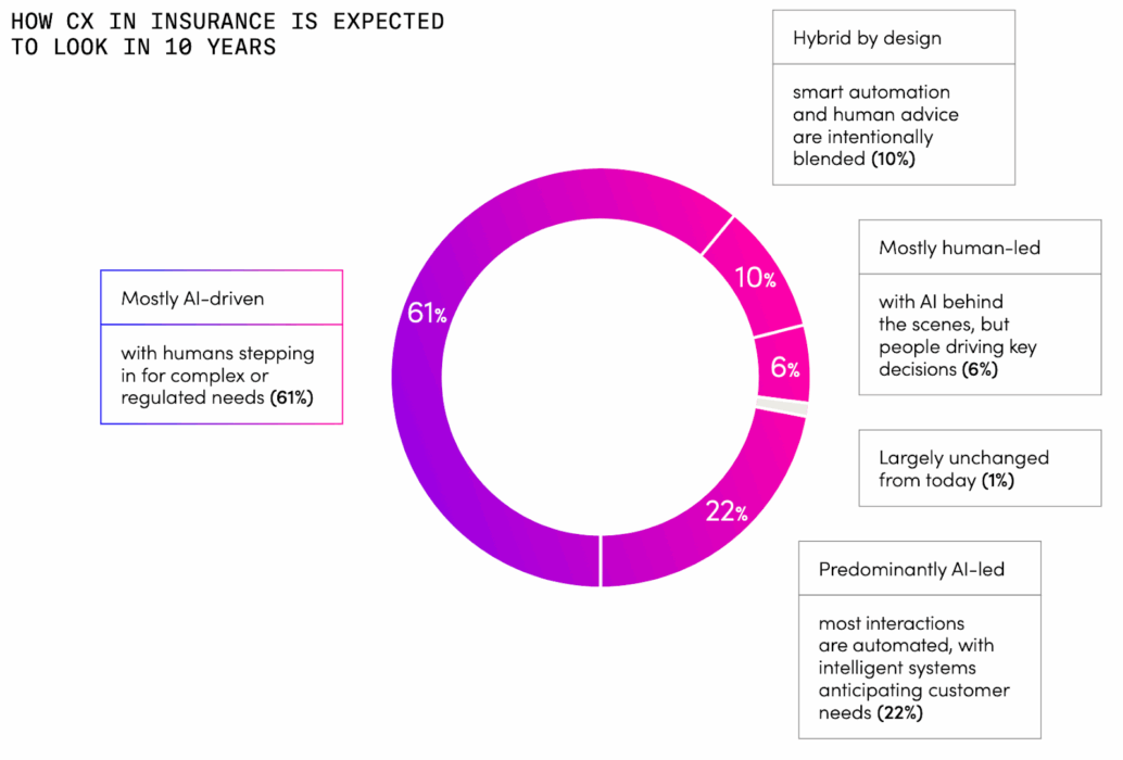 Whatever their primary motivation for rethinking CX, insurers are largely united in their vision of the industry’s future. More than eight of 10 (83%) say insurance CX will be AI-led within 10 years, with humans only stepping in where circumstances or regulations demand.