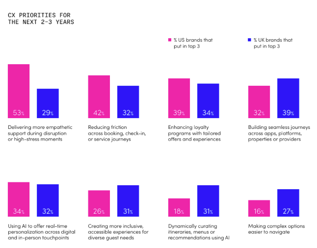 Travel brands are flexing CX strategies in response to these external forces, and this is reflected in their priorities for the next 2-3 years. For instance, when the market is saturated with almost infinite choices, it’s easy for people to go elsewhere. This makes sensitively handling pivotal moments, like complaints and issues, so crucial. So it’s no wonder 53% of U.S. travel brands say delivering more empathetic support during disruption is their number one CX priority. Meanwhile, both U.S. and U.K. brands are focusing on enhancing loyalty programs and reducing friction across booking and checking in.